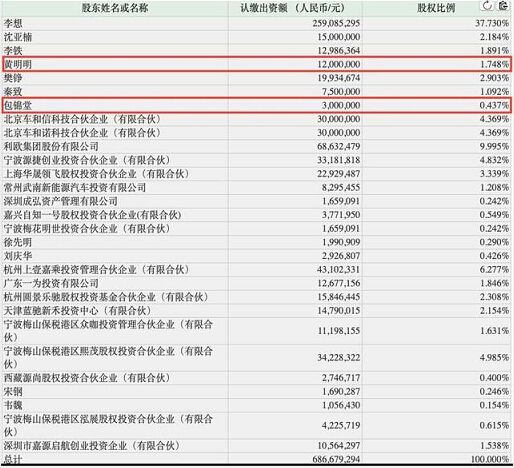 除了上述投資方,利歐股份兩次投資理想汽車所披露的信息顯示,其股東也包括一些個人企業家,比如華興資本CEO包凡的父親包錦堂、明勢資本創始人黃明明等。其中,明勢資本作為理想汽車唯一天使投資方,此后歷輪都追加投資,黃明明還自掏腰包,成為個人股東。
