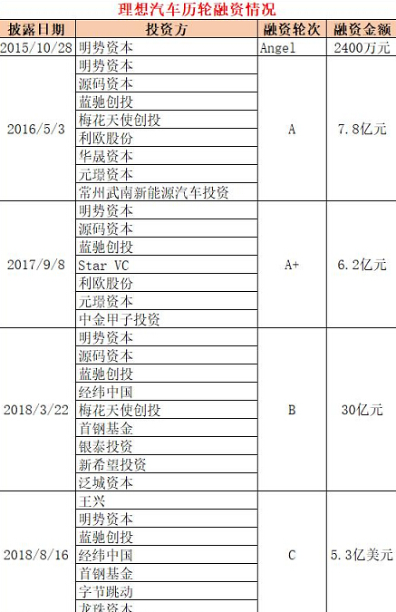 此輪融資后,理想汽車的累計融資額達到15.75億美元,投后估值約29.3億美元。從2015年至今,理想汽車經歷了天使輪、A輪、A+輪、B輪以及C輪共5輪融資,估值迅速提升。以2016年5月上市公司利歐股份披露的投資公告來看,當時利歐股份對理想汽車投資3.5億元,獲得其11.75%股權,以此估算,理想汽車當時估值約29.8億元。最新一輪融資后,其估值達到29.3億美元(約207億元人民幣),3年間估值增加了近6倍。而理想之家的每一輪融資,背后都不乏明星股東。據不完全統計,基金君將理想汽車歷輪融資情況梳理如下:
