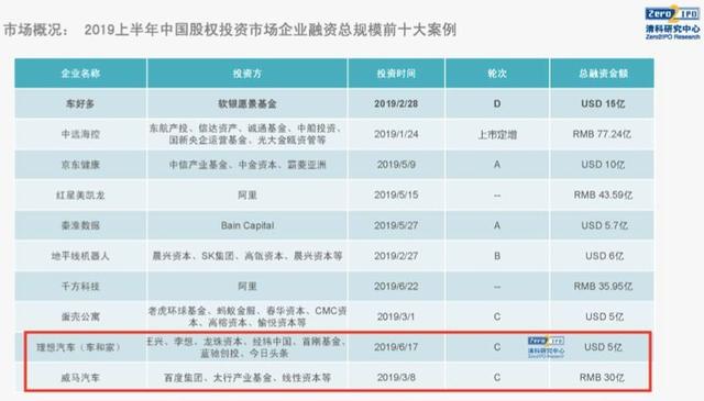 雖然理想汽車的本輪融資直到8月16日才官宣,但早在兩個月前,大概的投資金額及投資方已基本敲定。清科研究的數據顯示,2019上半年,在一級市場的所有行業中,汽車行業的融資案例和金額排名都不靠前,但由于汽車相關案例的單個融資額往往較大,因此在融資規模前十大案例中,理想汽車和威馬汽車均榜上有名。