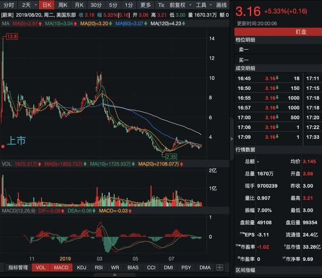截至今年7月,蔚來兩款車累計交付19727輛,其中今年交付量達到8379輛。而此前,蔚來制定的2019年銷量目標為4-5萬輛,從目前的交付量來看將遠遠不及預期。與此同時,蔚來傳聞已久的大裁員又有細節傳出。有知情人士透露,蔚來位于美國硅谷的分公司正在縮減規模,截至美東時間8月16日已裁減100名員工。最新這一輪裁員在今年7月份就已基本確定,當時確定的人數為150人。蔚來汽車創始人兼董事長李斌近日首次回應裁員傳聞稱,過去蔚來汽車員工已接近一萬人,本次減員是為了優化、更快地提升運營效果。車市寒冬,新勢力造車企業正在面臨考驗,艱難歲月,更要精益求精。近日還有媒體報道稱蔚來正計劃回科創板上市,同時已經關閉了其硅谷辦公室。對此,蔚來官方回應稱皆為不實報道,并表示硅谷辦公室是蔚來全球戰略布局的重要一環,一直處于正常的運營狀態。蔚來目前把體系化效率提升作為工作重點,員工優化會有序地進行。近期沒有回科創板的計劃。蔚來汽車去年9月登陸美股之初曾一路走高,沒幾天便創出13.8美元的新高價。然而就目前來看,上市即巔峰,從當時至今不到1年的時間,蔚來股價不斷走低,最新價在3美元上方,較當時高點跌幅超70%。