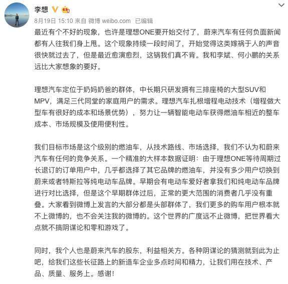 蔚來負面頻出,作為股東又疑似競爭對手的李想也被卷入輿論漩渦。8月19日李想發微博稱,最近有個不好的現象,蔚來汽車有任何負面新聞都有人往理想汽車身上甩,而且這種現象愈演愈烈,“這鍋我們真不背。”